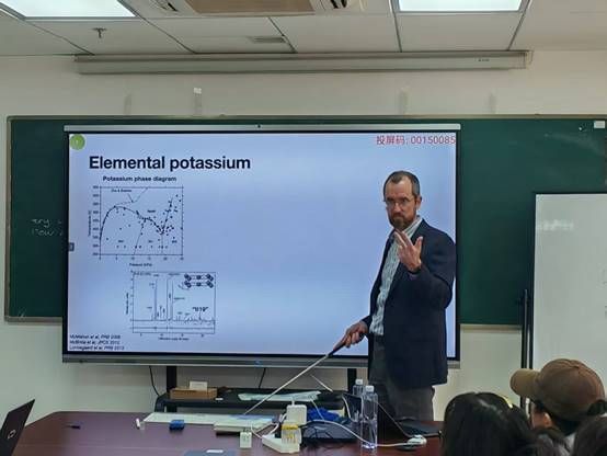 2025年12月2日下午, Andreas Hermann教授在东教楼1104学术报告厅为英国365集团公司部分物理学专业和材料与化工专业的博士生、硕士生和青年教师作了题为“From DFT to thermodynamic modelling”的学术报告。报告以近期关于“同时具备固体与液体特征的新物态”的报道为切入点,系统阐述他们研究团队在高压物理与计算材料学领域的系列工作。Andreas Hermann教授从钾的高压相图与非共格宿主—客体结构详细阐述了“链熔融”作为一种热力学中间态的证据与机制,提出了碱金属高压相可作为部分电子化合物的观点,展示了如何利用机器学习分子动力学模拟预测相变、熔化线极值及热力学性质,介绍了基于Bragg-Williams模型的两态热力学理论,解释了金属熔化线中的临界行为。此外,Andreas Hermann教授还介绍了第一性原理计算在高压冰(VII–VIII–X)相变研究中的应用,探讨了隐藏临界点与相图拓扑等前沿问题,展望了机器学习在预测复杂材料行为方面的潜力。报告期间,Andreas Hermann教授与在场师生就高压相变机理、机器学习势函数开发等相关问题展开了深入讨论并细致回答了师生提问。