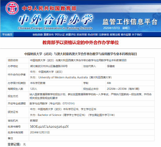 学校党委始终将国际化办学作为重要发展战略,高度重视对外教育合作交流。2025年3月起,英国365集团公司在国际合作处、本科生院、校办公室法规办,财务与资产管理部等职能部门的大力指导和支持下,组建专业专家团队系统谋划、周密组织,召开多轮内外专题研讨,并远赴澳大利亚,对西澳大学开展实地考察与深度交流,为合作项目的顺利推进筑牢基础。在学校领导的统筹部署与悉心指导下,在历经多轮磋商谈判、材料打磨与申报筹备,成功攻克各项难点,推动项目顺利通过教育部审批。该项目的落地,将搭建起中澳数学学科领域人才联合培养、学术科研协同创新、教学实践互鉴的优质平台。同时,依托这一合作纽带,还将推动两校在地质学、地质资源与地质工程等优势学科领域的深度交叉融合,为拓展更广泛的学术合作与人才联合培养空间奠定坚实基础。