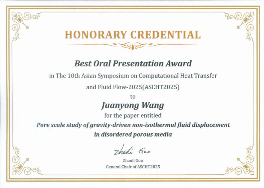 我院2025级博士研究生王隽永凭借其出色的研究工作和现场报告脱颖而出,荣获大会“最佳口头报告奖”(Best Oral Presentation Award)。王隽永同学的获奖报告题目为《Pore scale study of gravity-driven non-isothermal fluid displacement in disordered porous media》。该研究聚焦于蒸汽辅助重力泄油(SAGD)等强化采油技术中的关键物理过程,利用格子玻尔兹曼方法进行高精度的孔隙尺度数值模拟,系统揭示了在复杂的地下油藏环境中,孔隙结构的非均匀性、孔壁的润湿性以及固液相间的共轭传热如何共同影响多相流体的驱替模式和相变动力学。研究观察并阐释了均匀孔隙结构中的“聚并式”Haines跃迁现象,并探究了两种不同的界面运移模式:“蒸发-扩散侵入”与“快速侵入” 。这些成果对于优化非均质油藏的蒸汽注入策略、提高采收率具有理论指导价值和工程应用前景。