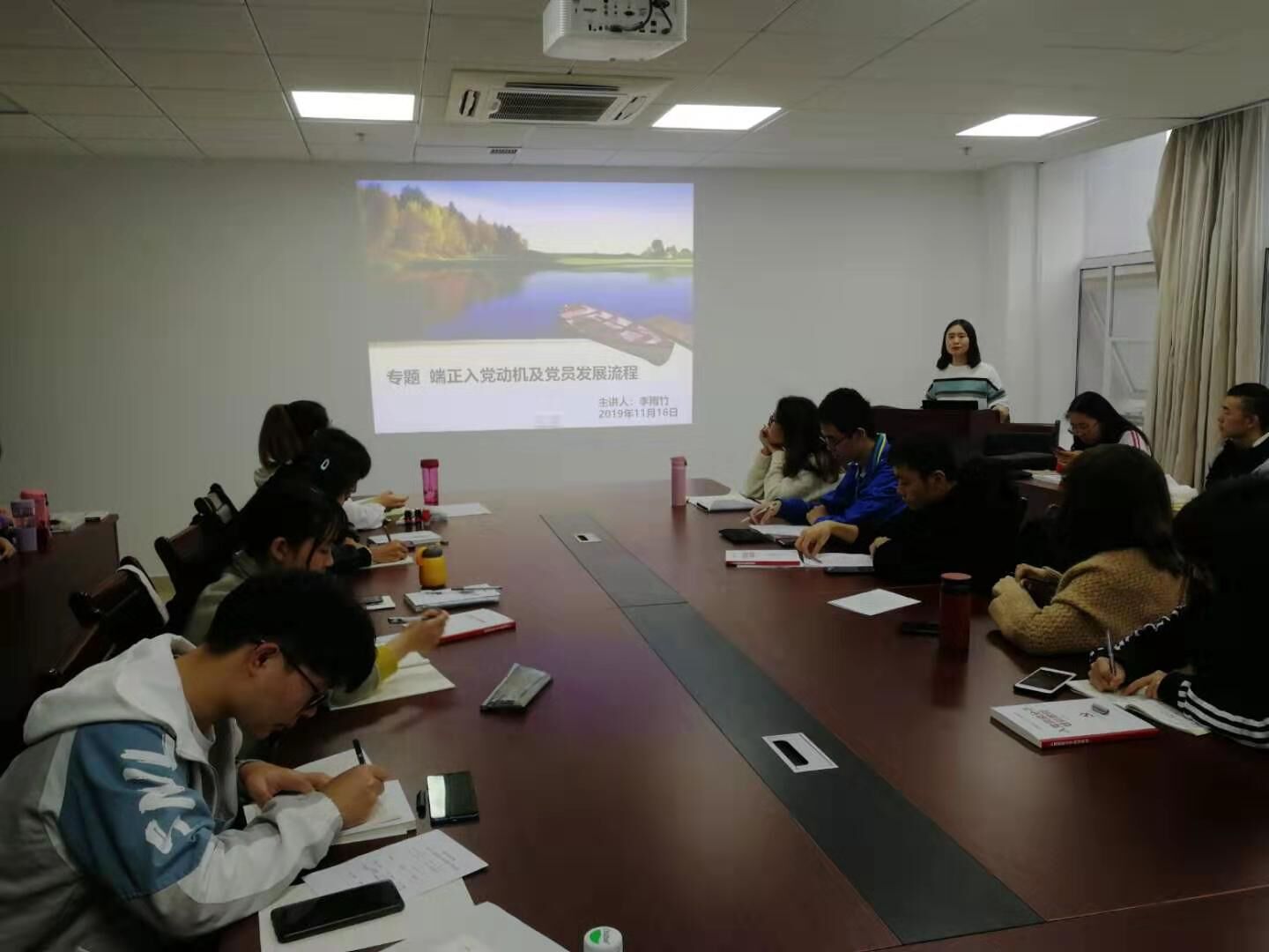 11月16日下午,英国365集团公司第66期入党积极分子培训班第三讲在东区教学综合楼A1505会议室举行。党委组织部李雨竹老师主讲,主题为端正入党动机及党员发展流程。孙宇涛老师主持。